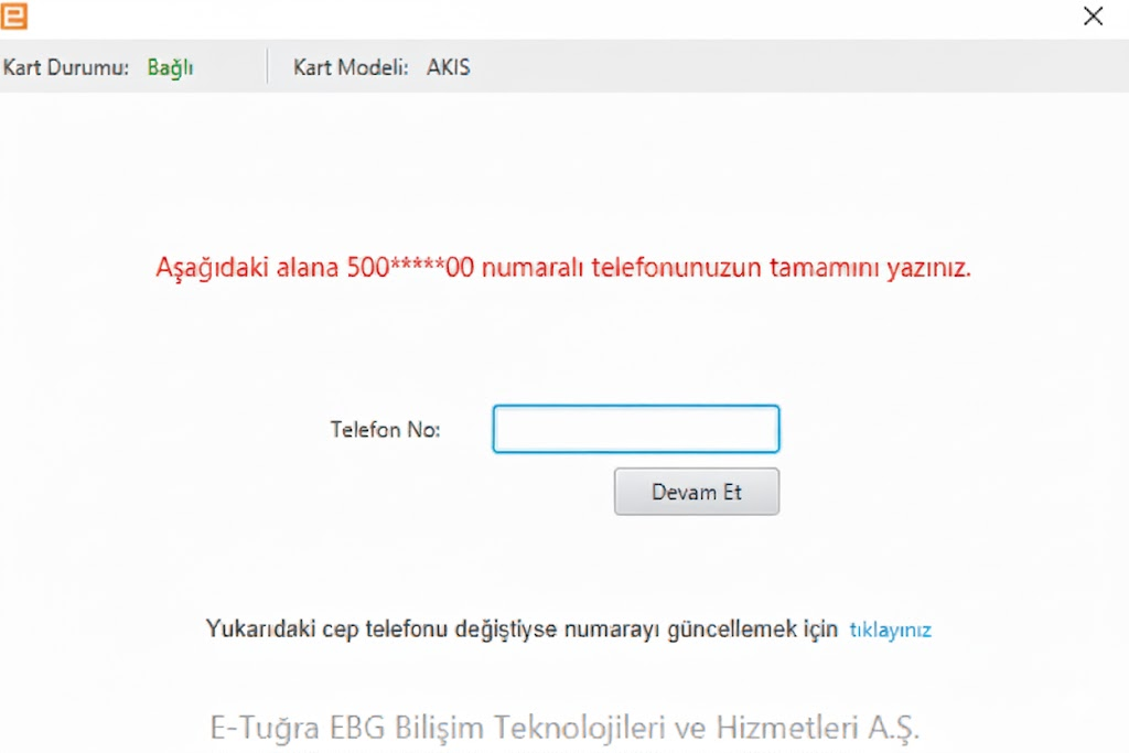 Açılan ekranda e-imza kullanıcısının maskelenmiş telefon numarası verilmiştir. Bu telefonun tamamını yazarak Devam Et butonuna tıklayınız