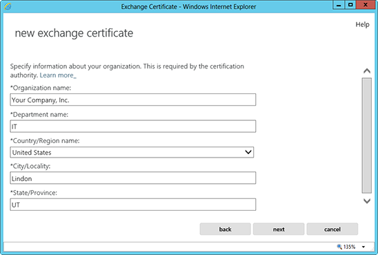 Açılır pencerede ;"new exchange certificate" sihirbazı görünecektir.